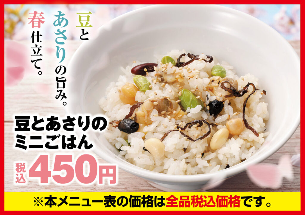 ホームお知らせ【予告】豆とあさりのミニごはん 期間限定販売 2026.02.18 お知らせ 【予告】豆とあさりのミニごはん 期間限定販売 2026年2月24日から販売予定※一部店舗では販売しておりません 前の記事 一覧に戻る